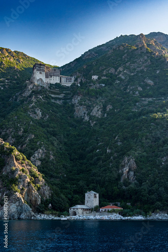 Fototapeta premium orthodox christian monastery sits on mountain side of mount athos