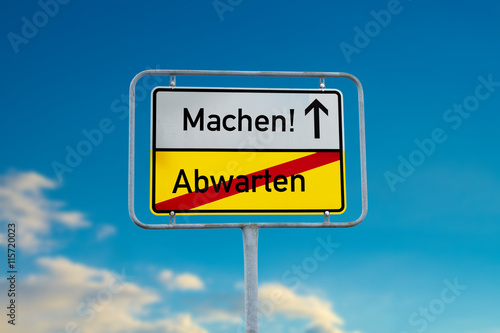 © timyee, Obraz premium Ortsschild Machen/Abwarten