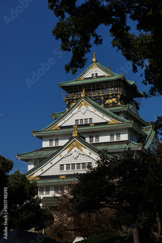 Fototapeta premium Osaka Castle Osaka-jo: A Japanese Fortress With Green Roofs Against a Clear...