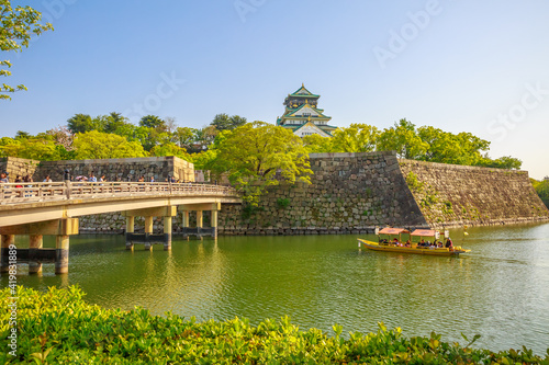 © bennymarty, Obraz premium Osaka, Japan - April 30, 2017: Golden Wasen, a touristic boat, along the moat of Osaka Castle and Gokurakubashi Bridge, one of the best activities you can experience around Osaka Castle area.