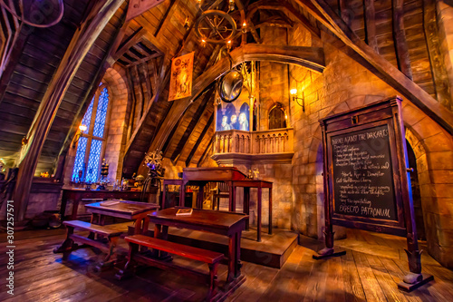 Naklejka premium OSAKA, JAPAN - AUGUST 12, 2018: Photo of Hogwarts Castle. The Wizarding World...