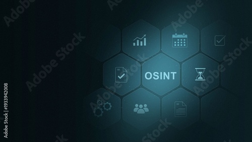 © Masha Stock, Fototapeta premium OSINT Open Source Intelligence Hexagonal Infographic with with gears Background OSINT data analysis. digital interface on cyan color background. and 3d illustration