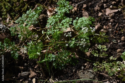 Fototapeta premium Osmorhiza aristata is a perennial apiaceae that grows in the shade of a tree...