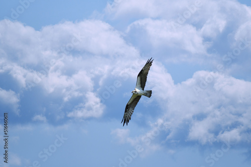 Fototapeta premium osprey in flight under a blue sky, with clouds