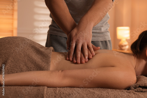 © New Africa, Obraz premium Osteopath massaging woman's back on couch indoors, closeup. Manual therapy