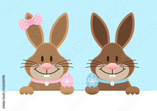 © Jan Engel, Fototapeta premium Osterhasen Mädchen & Junge Groß Ostereier Banner Horizontal Himmel