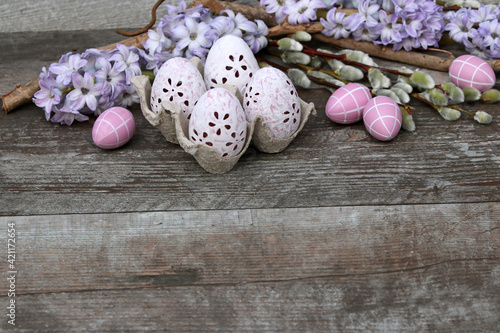 Obraz premium Osterhintergrund - Ostereier mit Hyazinthen und Weidenkätzchen