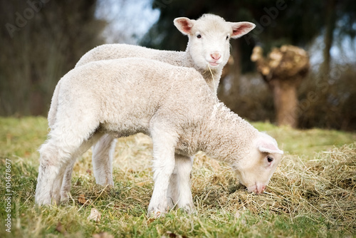© Countrypixel, Obraz premium Osterzeit - zwei niedliche Lämmer vor Holzung