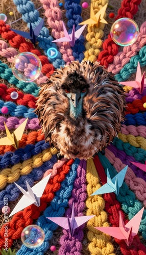 © Sam-th, Fototapeta premium Ostrich Surrounded by Colorful Textiles and Whimsical Paper Cranes with Bubbles in a Playful Setting