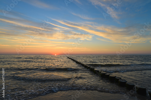 © motivthueringen8, Naklejka premium Ostsee mit Buhnen, blauer Himmel kurz vor Sonnenaufgang