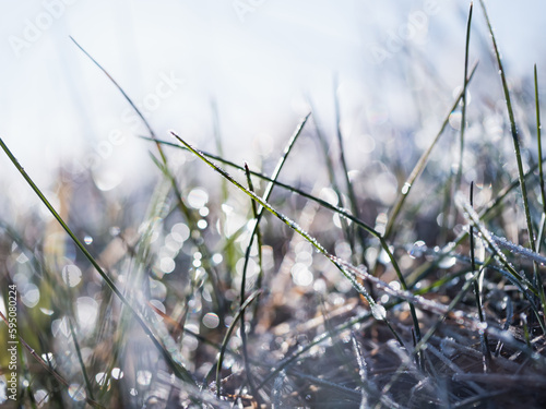 Obraz premium Oszroniona trawa w promieniach porannego słońca