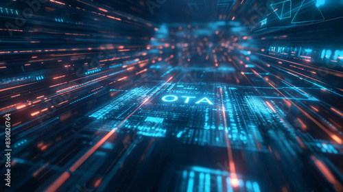 © Maksym, Fototapeta premium "OTA" centered within a flowing stream of digital information, illustrating a firmware update process in a modern, high-tech environment