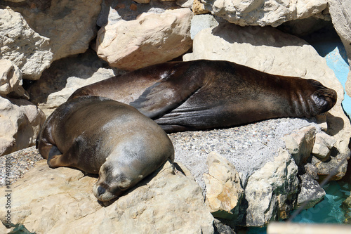 © Minnitre, Obraz premium Otarie o leoni di mare dormono sdraiati sulla roccia