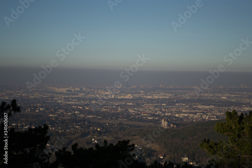 Obraz premium Oto widok ze Świątyni Huzarów w Mödling w Dolnej Austrii. Należy zaznaczyć, że zdjęcia pokazują, jak poważne jest zanieczyszczenie powietrza w Wiedniu.