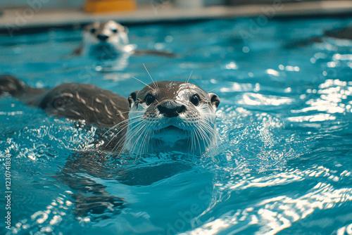 Fototapeta premium Otter swimming in turquoise pool, another otter in background.