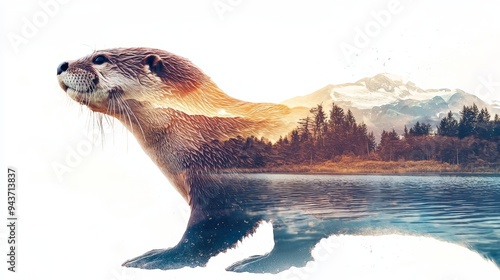 © Nattapol, Fototapeta premium Otter with mountain and lake double exposure