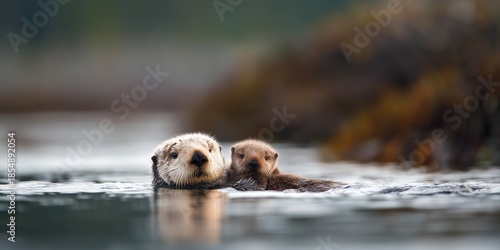 © fotofabrika, Obraz premium Otters with their young floating on water in a natural habitat during daylight