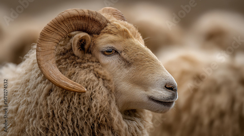 © Herma, Fototapeta premium “Ouessant Sheep Ram Portrait with Horns – Breton Dwarf Sheep”