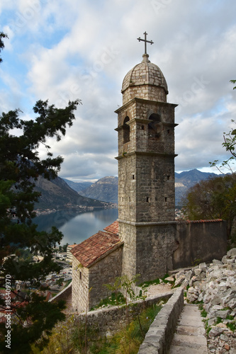 Fototapeta premium ‘Our Lady of Remedy’ Church high above the town and the bay of Kotor, Montenegro