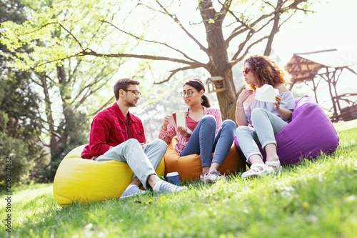 © zinkevych, Fototapeta premium Our work. Concentrated pretty woman sitting in the open air with her co-workers and discussing their project