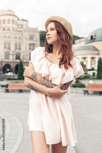 © Viktoriia, Naklejka premium Ourdoors Leisure. Girl standing on the city street crossed arms looking aside thoughtful