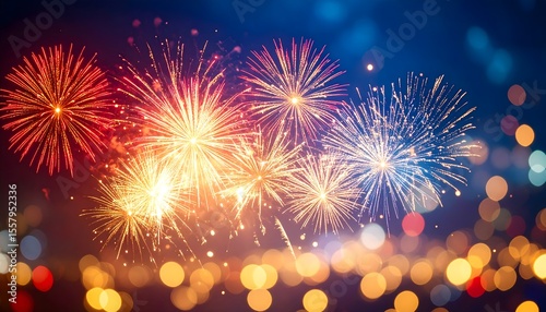 Naklejka premium Out-of-focus fireworks bokeh lights on a dark background, dreamy sparkles in...