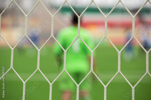 Fototapeta premium out of focus goalkeeper stands behind the football net in the stadium