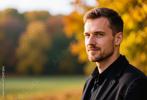 © Selim Aysolmaz, Obraz premium Outdoor autumn portrait of a handsome man with short light brown hair and trimmed beard, wearing a black jacket, standing in a sunlit field with golden foliage in the background.