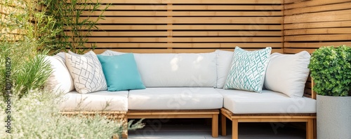 © Photo18@desing, Obraz premium Outdoor Bamboo Sofa with Greenery, Cozy Patio, Outdoor furniture