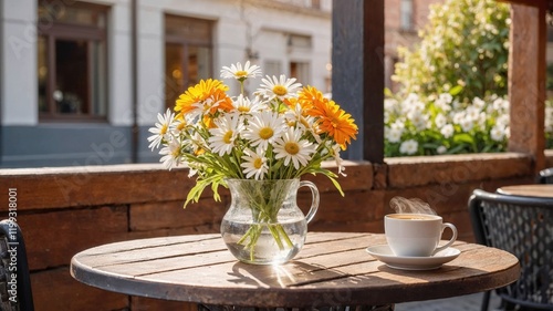 Fototapeta premium outdoor cafe setting with a bouquet of fresh daisies in a pitcher and a steaming cup of coffee, offering a cozy and inviting atmosphere in a peaceful outdoor space