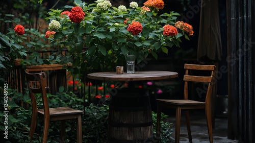 Fototapeta premium Outdoor cafe table, flowers, romantic ambiance, quiet courtyard, relaxing