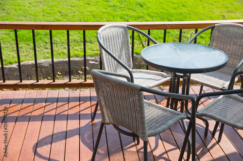 © Quality Stock Arts, Fototapeta premium outdoor cafe table in the park clean new empty.