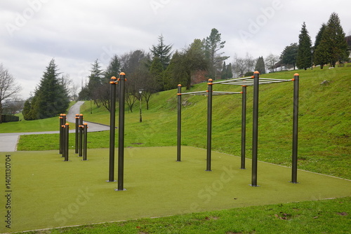 Fototapeta premium Outdoor calisthenics gym equipment inviting fitness enthusiasts in park setting