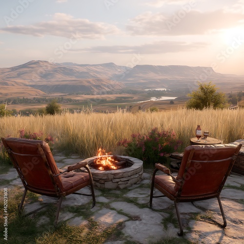 © Big9869, Fototapeta premium Outdoor Cozy Evening with Fire Pit and Two Chairs Overlooking Calm Valley and Sunset in the Horizon