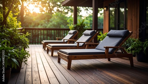 Obraz premium Outdoor deck lounge chairs at sunset