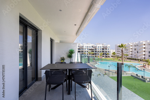 Obraz premium Outdoor dining area on modern apartment balcony with pool view, palm trees,...