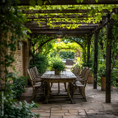 © bintank, Obraz premium Outdoor Dining Area Under Pergola