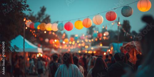 © MNStudio, Naklejka premium Outdoor festival with colorful lanterns and people enjoying the festivities on evening.