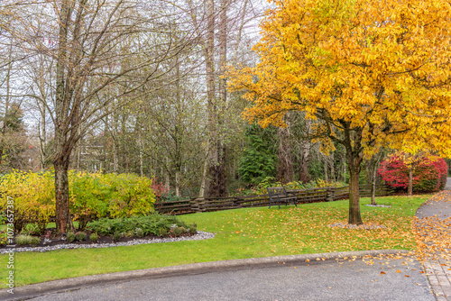 Fototapeta premium Outdoor landscape with green lawn, red and yellow trees and nice Fall foliage in Vancouver, Canada, North America. Overcast. Day time on November 2024.