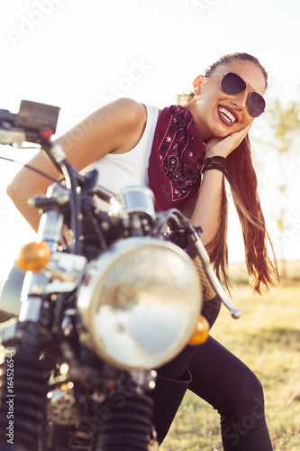 © zorandim75, Fototapeta premium Outdoor lifestyle portrait of young biker woman sitting on a vintage custom motorcycle