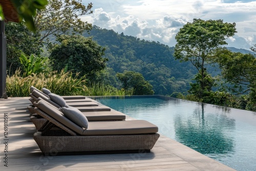 © Ruslan, Obraz premium Outdoor lounge set for poolside relaxation