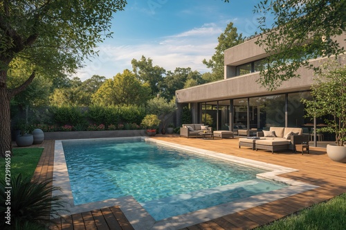 © The 2R Artificiality, Fototapeta premium Outdoor patio area featuring a swimming pool