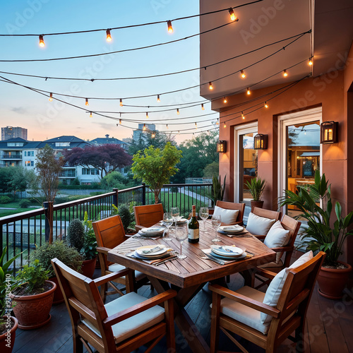 © GrayAza, Naklejka premium Outdoor patio dining area with string lights at sunset