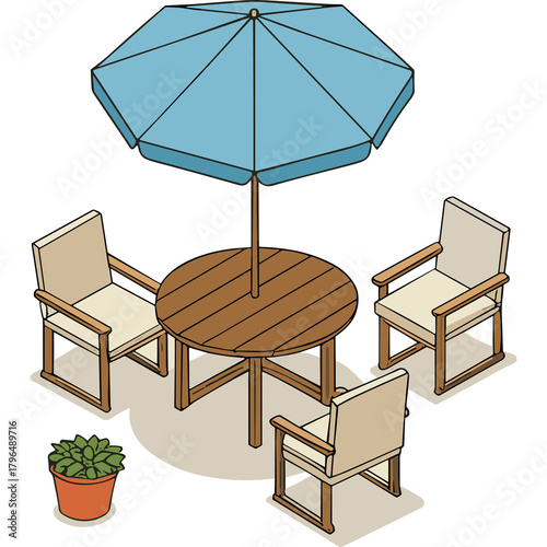 Obraz premium Outdoor Patio Set With Round Wooden Table Four Chairs And Blue Umbrella And Potted Plant In Isometric View