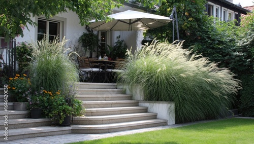Obraz premium Outdoor patio with stone steps and lush plantings