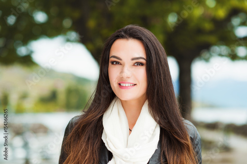 © annanahabed, Fototapeta premium Outdoor portrait of beautiful brunette woman with long hair, wearing big white cashmere scarf and black leather jacket