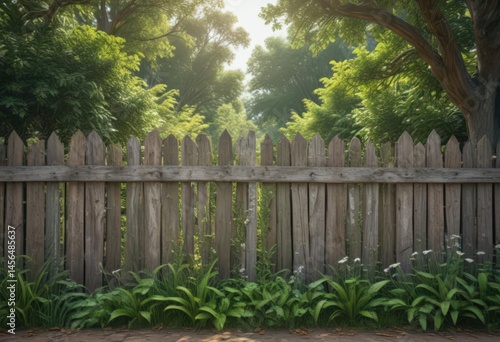 © Min, Fototapeta premium Outdoor poster on weathered fence, lush park backdrop, vibrant greenery, marketing, outdoor