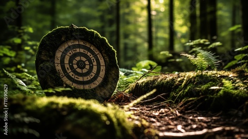 © PRI, Fototapeta premium Outdoor precision sport with a paper target on a tree stump, arrows marking successful hits in a natural setting