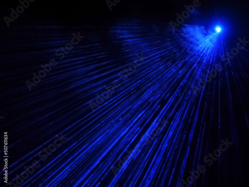 © jockermax3d, Fototapeta premium Outdoor projector shines bright neon blue beams in the dark. Laser show. Blurred image