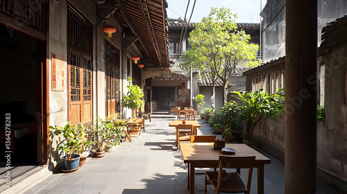 Naklejka premium Outdoor Restaurant Patio View Wooden Tables And Chairs With Chinese Style...